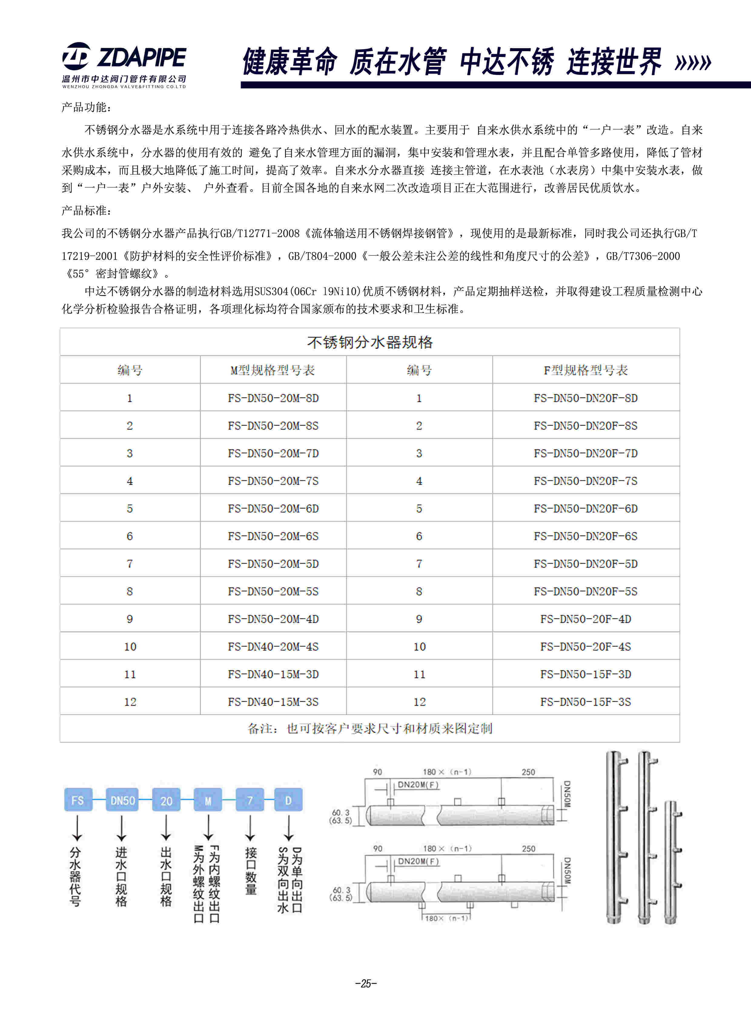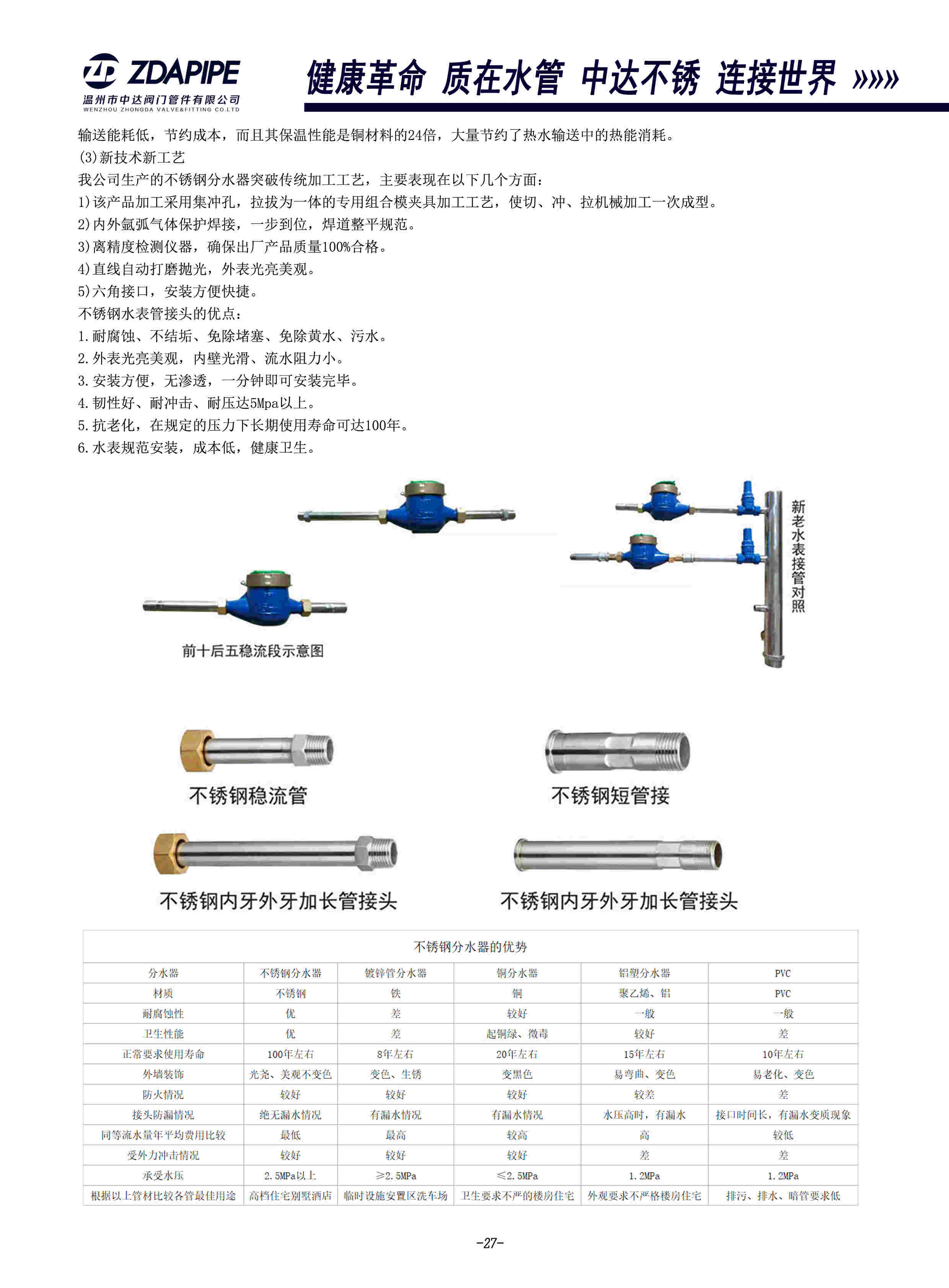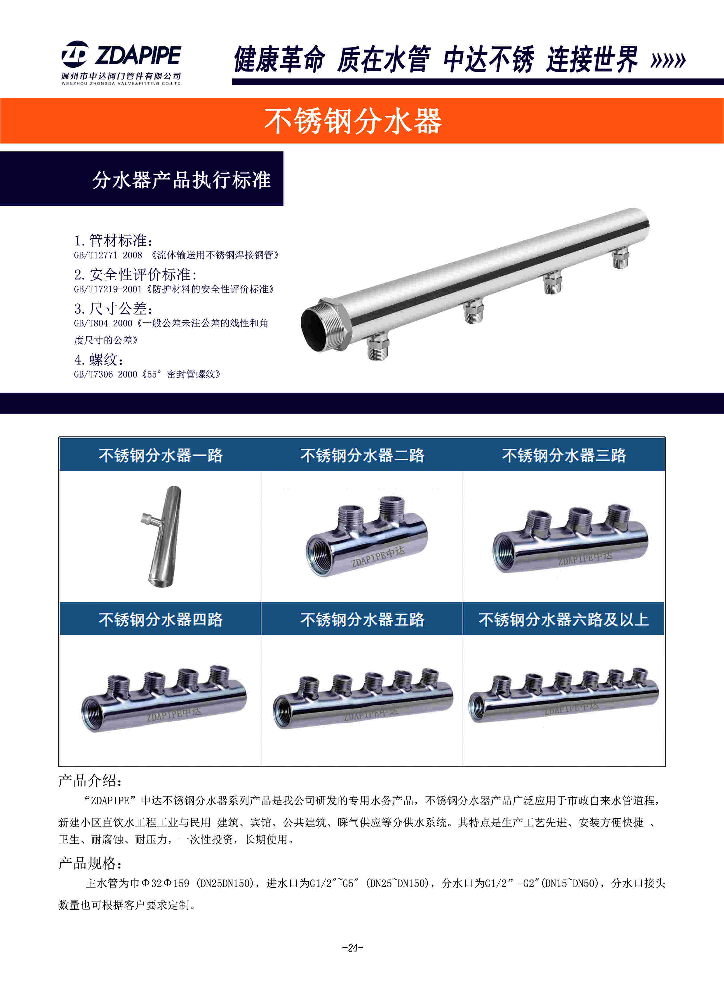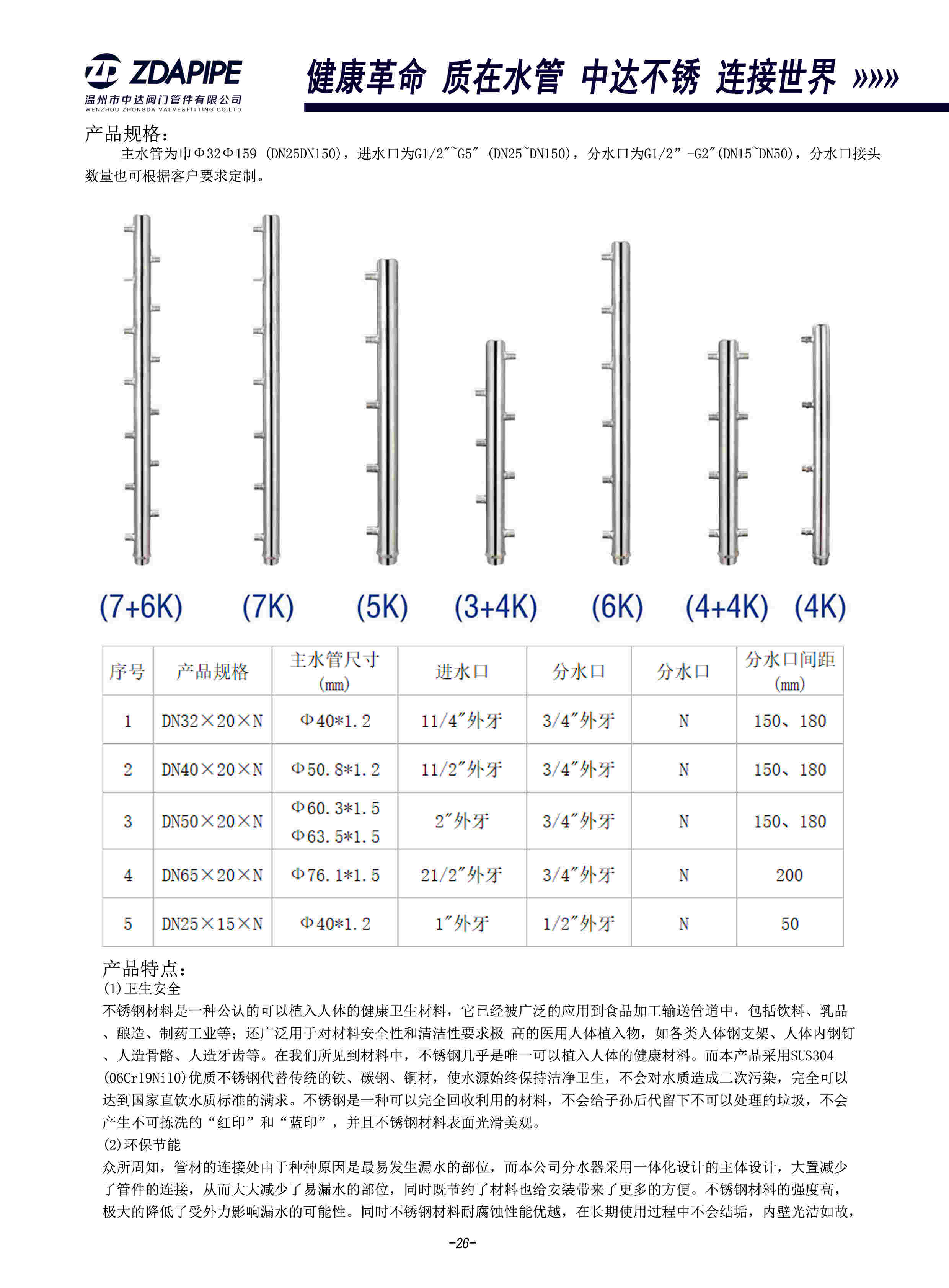 隨著(zhù)我們生活水平的日益提高,分水器的品質(zhì)也不斷上升,從原始的鍍鋅,PVC塑料等對人體有害的材質(zhì)到現在不銹鋼材質(zhì)。ZDAPIPE中達牌不銹鋼分水器集分水器本身特點(diǎn),進(jìn)行了創(chuàng )造。從常規產(chǎn)品到非標產(chǎn)品我們都進(jìn)行了質(zhì)量升,外表得到了很大